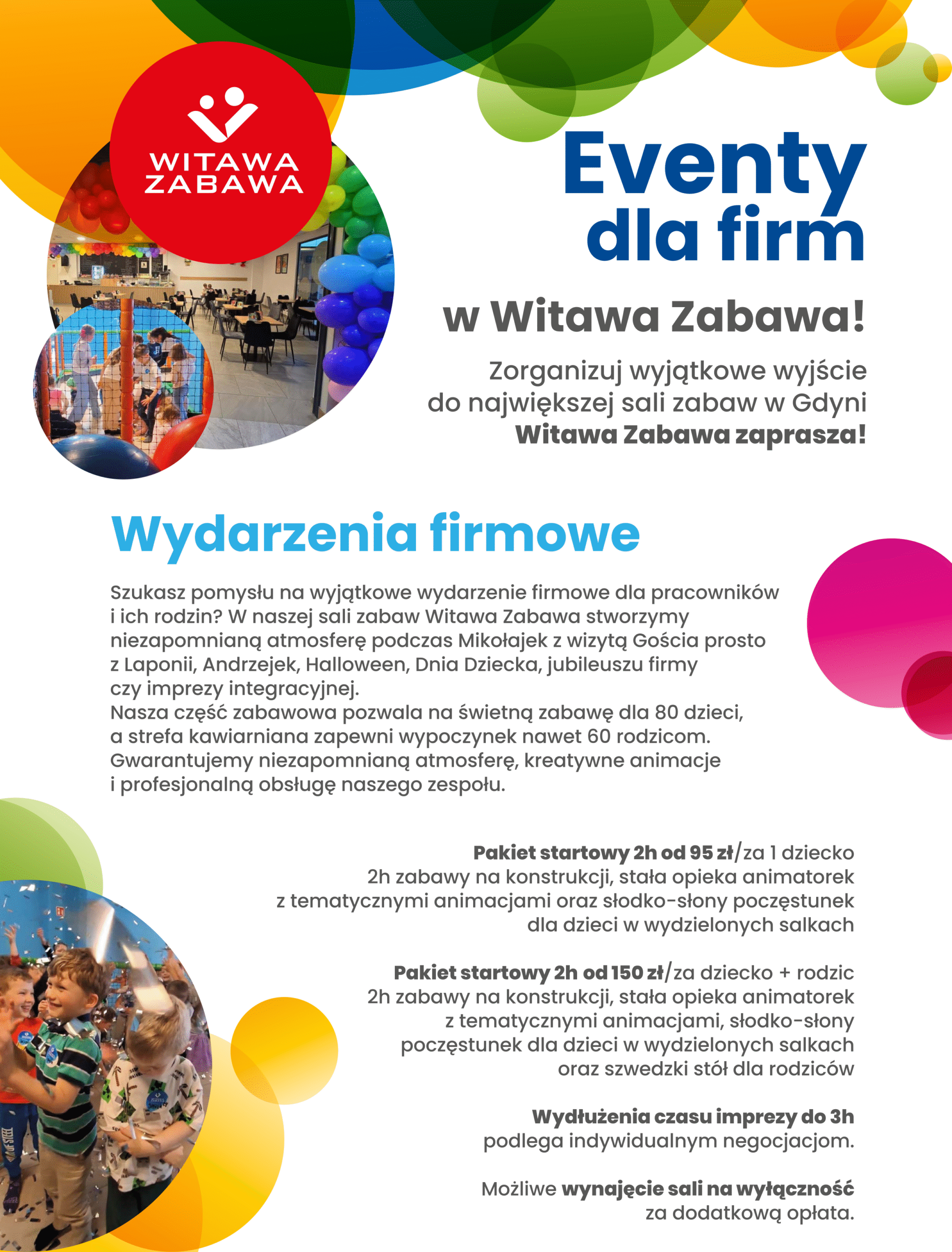 Dlatego zapraszamy do Witawa Zabawa, gdzie stworzymy niezapomnianą atmosferę podczas Mikołajek z wizytą gościa prosto z Laponii, Andrzejek, Halloween, Dnia Dziecka, jubileuszu firmy czy imprezy integracyjnej. Co więcej, nasza część zabawowa pozwala na beztroską zabawę nawet 80 dzieci, a strefa kawiarniana zapewnia komfortowy wypoczynek dla 60 rodziców. W rezultacie każdy gość może poczuć się wyjątkowo i spędzić czas zgodnie ze swoimi potrzebami. Dodatkowo oferujemy kreatywne animacje i profesjonalną obsługę naszego zespołu, co przekłada się na wysoki poziom satysfakcji uczestników.